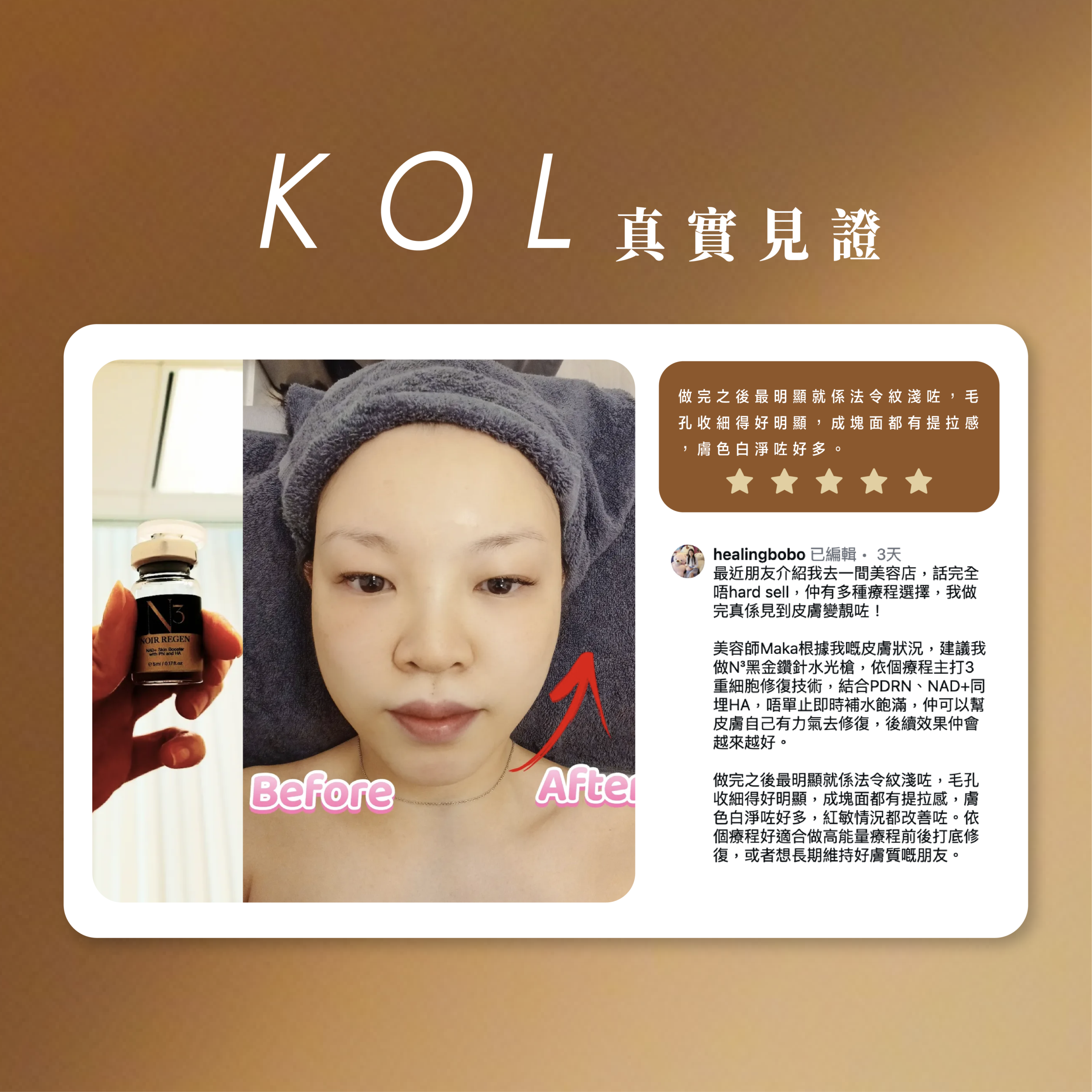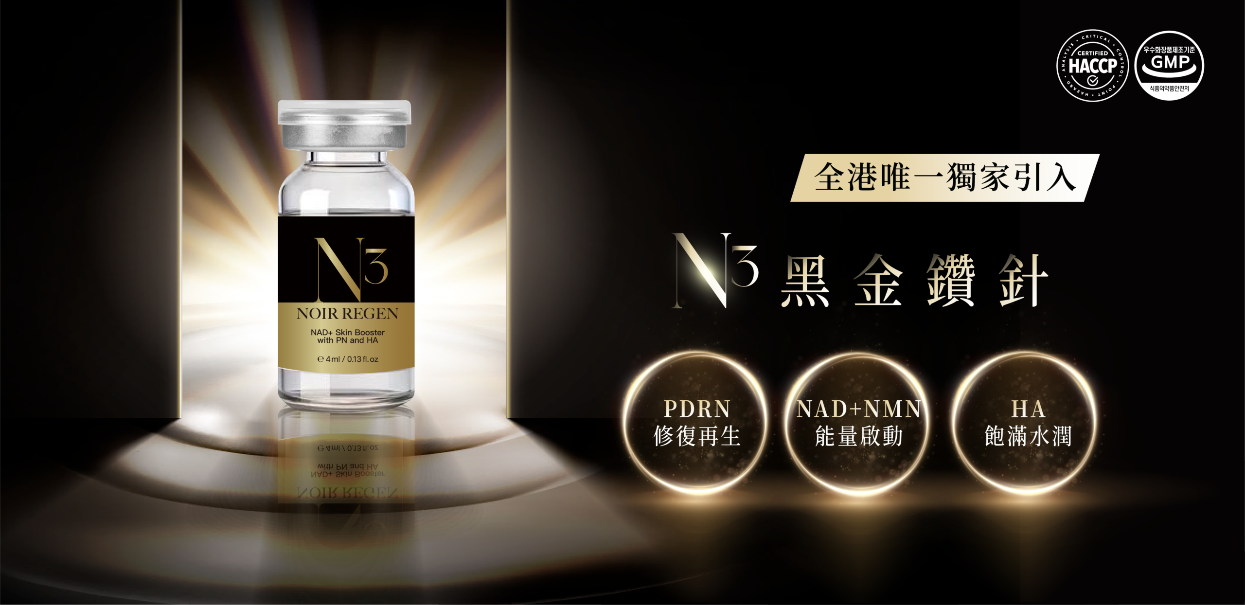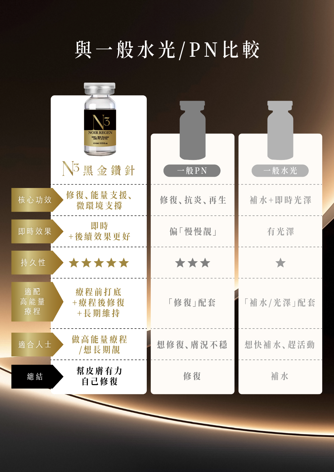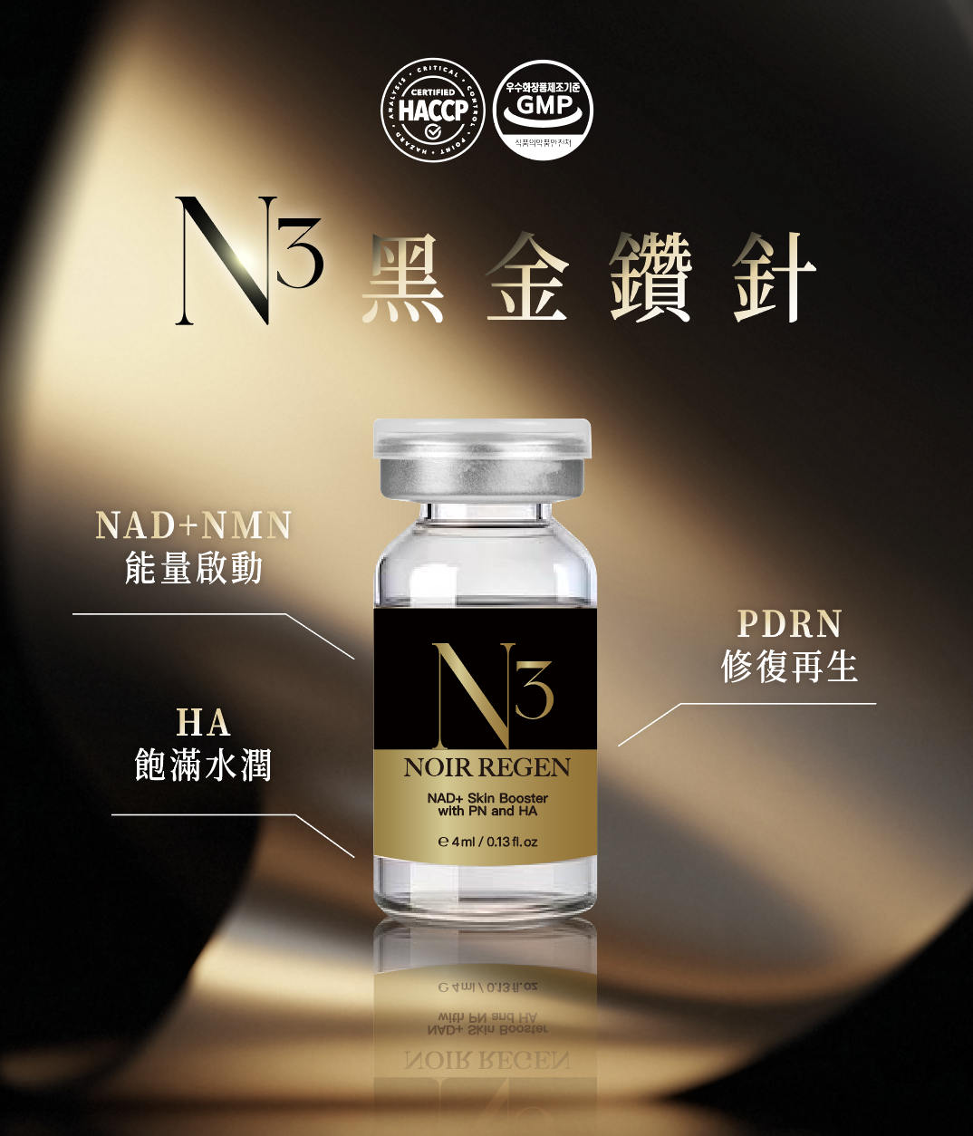 N³ 黑金鑽針結合 PN、NAD+ 及透明質酸,針對暗沉、乾燥、粗糙及初老肌膚,從肌底修復與補水,提升膚質細緻度與光澤感。
